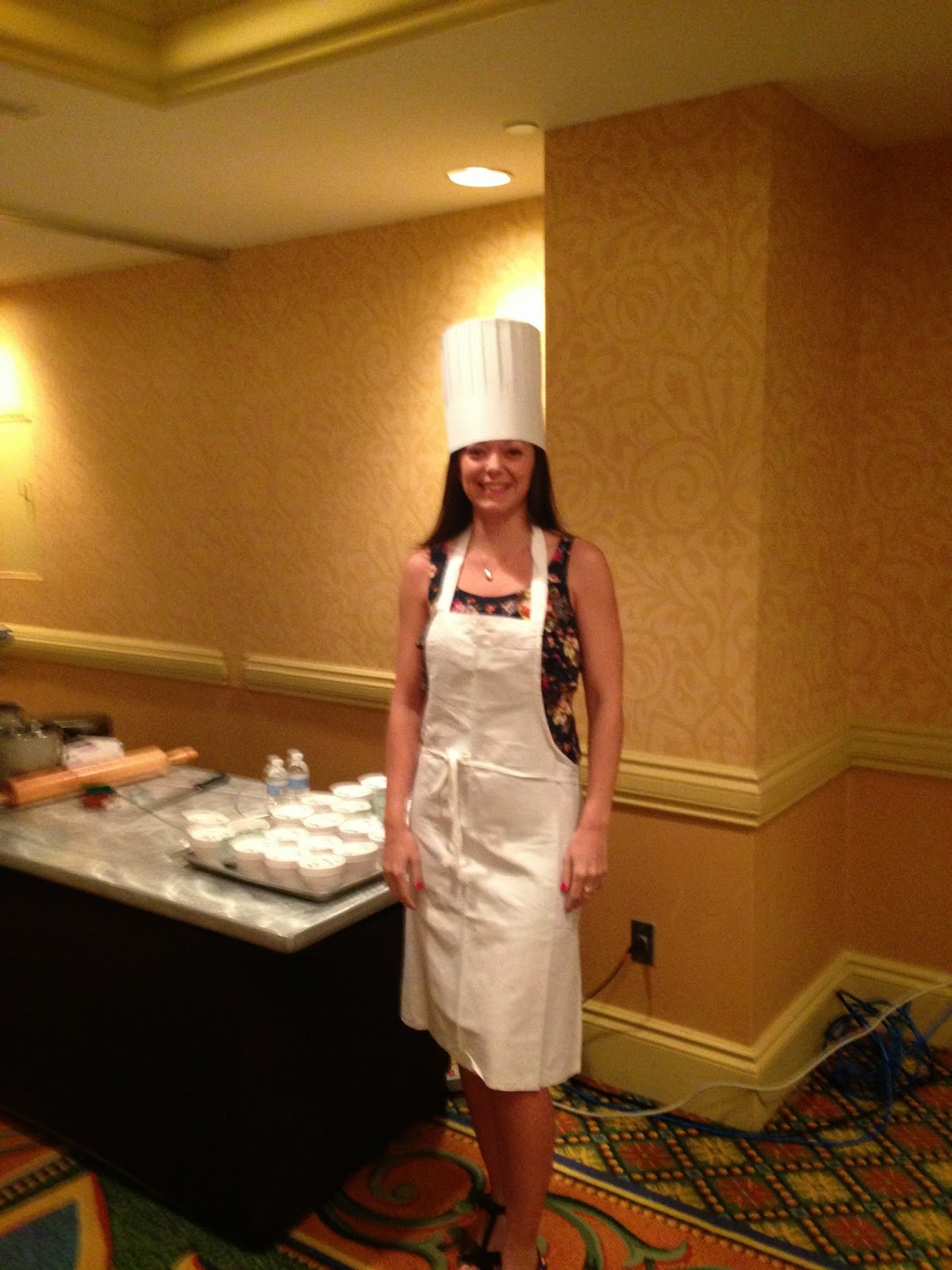 The room was set up with each place setting featuring a cookie recipe card, a Chef’s hat, trays of dough and cookies, and aprons. The executive chef, Mark Heimann, completed a demonstration of how to prepare each cookie we had on our tray. Our trays had a gingerbread cookie, a sugar cookie, and a peppermint pinwheel – all baked and ready to decorate. Our trays also had some raw dough that we could shape and take home to bake.